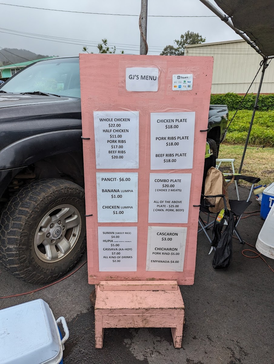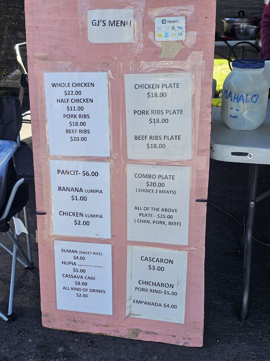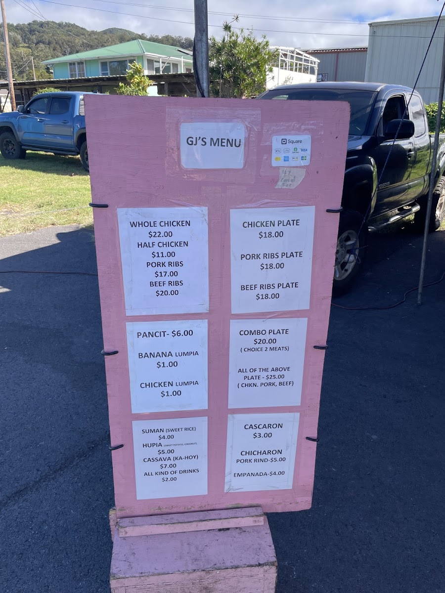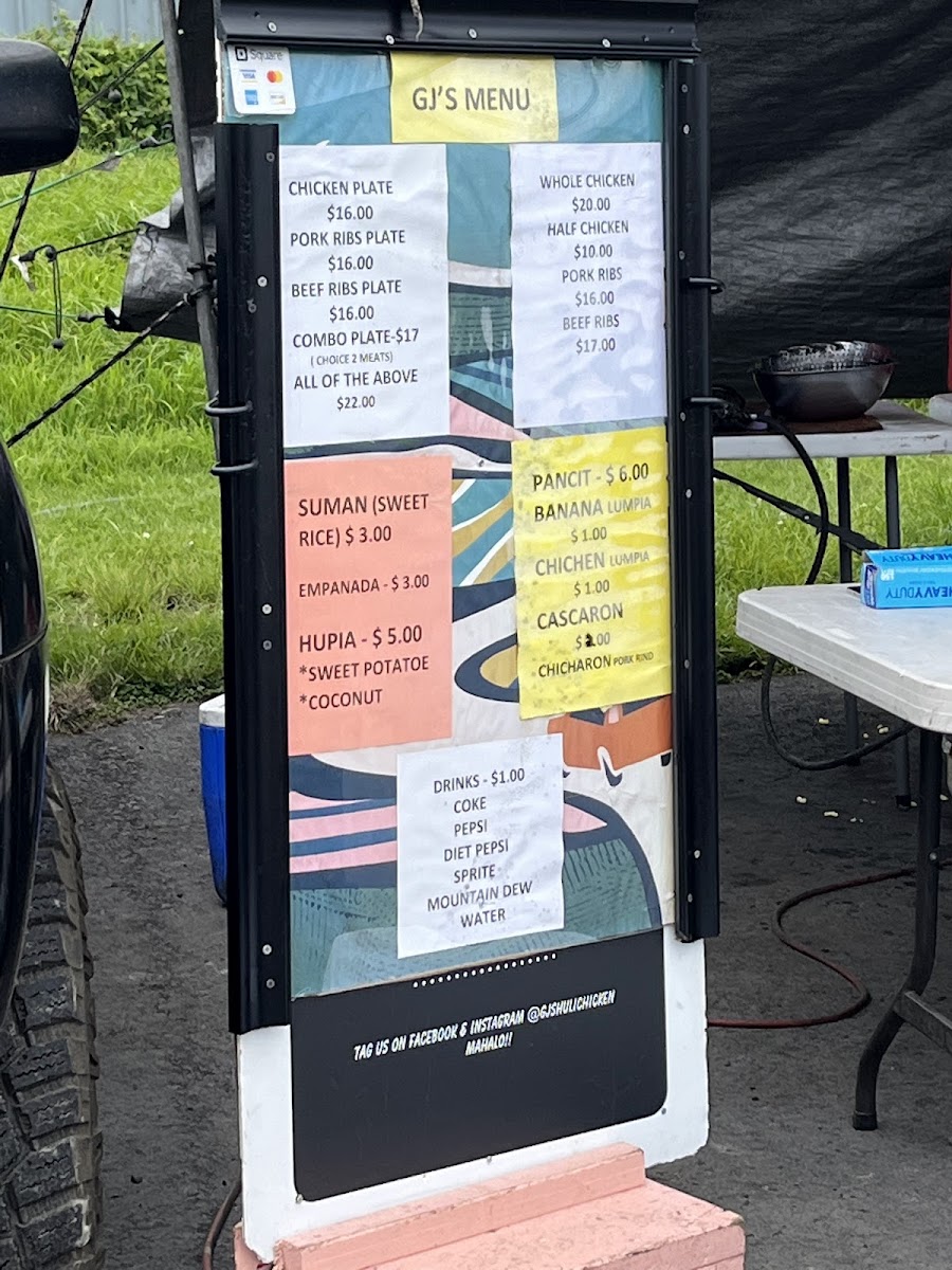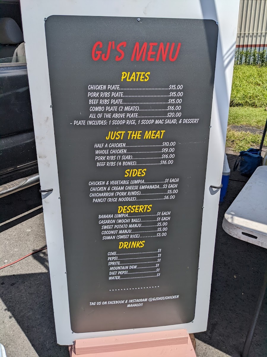 At Gj's Huli Chicken, located at 364001043, Waimea, HI 96743, the menu offers a delightful array of traditional Hawaiian and Filipino-inspired dishes that are perfect for satisfying any appetite. The Chicken Plate is a standout, with its savory, flavorful chicken served alongside your choice of sides. For those craving something more substantial, the Pork Ribs Plate and Beef Ribs Plate provide a hearty and tender option, with the rich, smoky flavors of the meat being a crowd favorite. If you're looking for variety, the Combo Plate brings together a mix of meats, while the All Of The Above Plate allows you to sample everything on the menu.